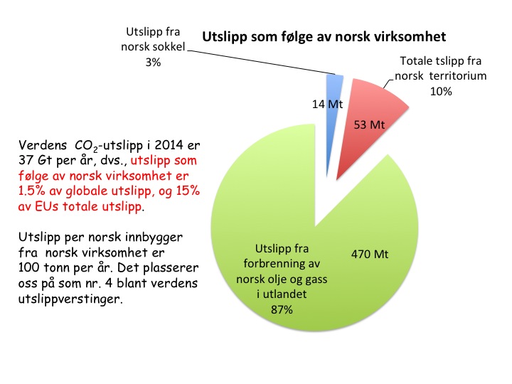 Verdens CO2-utslipp i 2014 er 37 Gt per år, dvs., utslipp som følge av norsk virksomhet er 1.5% av globale utslipp, og 15% av EUs totale utslipp. Utslipp per norsk innbygger fra norsk virksomhet er 100 tonn per år. Det plasserer oss på som nr. 4 blant verdens utslippverstinger. Endring i norsk utvinningstempo kan altså potensielt gi store reduksjoner i globale utslipp.