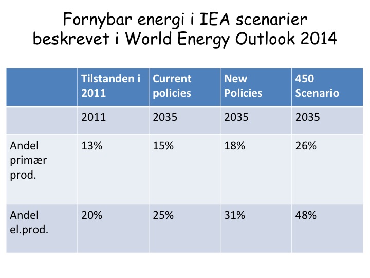 Holtsmark tar utgangspunkt i det internasjonale energibyråets (IEA) referansescenario (current policies) når han vurderer framtidas behov for fornybar kraft. Dette er et scenario for 4-6 graders global oppvarming i dette århundret. Dette er en uholdbar premiss for enhver som ser det som et overordnet etisk/politisk mål å forhindre en global klimakatastrofe. IEA har imidlertid også utviklet et 450 scenario (begrensning av CO2 i atmosfæren til 450 ppm), som bringer oss på en utslippsbane for å realisere 2-gradersmålet. Dette scenariet forespeiler at fornybare kilder står for nesten halvparten av verdens produksjon av elektrisk kraft innen 2035 (se tabellen).